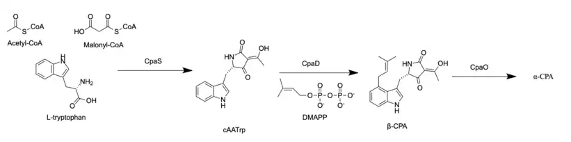 Three enzymes are utilized in the biosynthesis of α-CPA: the polypeptide CpaS, dimethylallyltransferase (CpaD), and flavoprotein oxidocyclase (CpaO).[3] CpaS is the first enzyme in the biosynthetic pathway and is a hybrid polyketide synthase- nonribosomal peptide synthetase (PKS-NRPS). It uses the precursors acetyl-CoA, malonyl-CoA, and tryptophan to produce cyclo-acetoaceytl-L-tryptophan (cAATrp).[3] The intermediate cAATrp is then prenylated with dimethylallyl pyrophosphate (DMAPP) by the enzyme CpaD to form the intermediate β-CPA. CpaD has high substrate specificity and will not catalyze prenylation in the presence of DMAPP's isomer isopentyl pyrophosphate (IPP) or the derivatives of cAATrp.[2] The third enzyme, CpaO, then acts on β-CPA through a redox mechanism that allows for intramolecular cyclization to form α-CPA.[3]