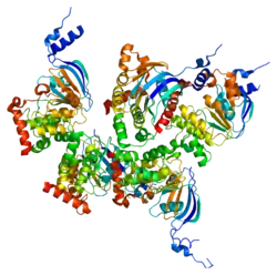 The CFTR gene is approximately 189 kb in length, with 27 exons and 26 introns.[34] CFTR is a glycoprotein and is found on the surface of many epithelial cells in the body.[35] CFTR consists of 5 domains, which include 2 transmembrane or membrane-spanning domains, 2 nucleotide-binding domains and a regulatory domain.[36] The transmembrane domains are each connected to a nucleotide binding domain (NBD) in the cytoplasm. The first NBD is connected to the second transmembrane domain by a regulatory "R" domain that is a unique feature of CFTR, not present in other ABC transporters which carries 19 predicted sites for protein kinase A(PKA). Six of these have been reported to be phosphorylated in vivo.[37] The ion channel only opens when its R-domain has been phosphorylated by PKA and ATP is bound at the NBDs. Phosphorylation displaces the disordered R domain from positions preventing NBD dimerization and opening.[38][39] The amino-terminus is part of the lasso motif which anchors into the cell membrane.[37] The carboxyl terminal of the protein is anchored to the cytoskeleton by a PDZ-interacting domain.[40] The structure is shas(PDBitsI) shows a homopentameric assembly of mutated NBD1, the first nucleotide binding domain (NBD1) of the transporter