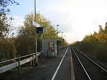 Elsdorf (Rhld)—short for Rhineland—station (meaning at line-kilometre 14.9 of the Düren–Neuss line was referred to in the timetables of the 1970s as Elsdorf (Rhld) West, as the town had another station, Elsdorf (Rhld) Ost (east), from which passenger trains ran to Bergheim (Erft) until 1961 and freight trains until 1967. In the 1980s, the entrance building of Elsdorf (West) was demolished together with signal box “Ent” on Köln-Aachener Straße and was replaced by a small shelter. From 27 May 1995 the passenger traffic was discontinued in the Düren–Bedburg section, on 31 December of the same year, the freight traffic. The line was closed permanently on 2 June 1996. The Düren–Elsdorf section was in the area of today's Hambach lignite mine and was therefore dredged. The Elsdorf–Bedburg section was initially still used for freight, bit it later closed due to lack of demand and dismantled. The site of the station is now a parking area. The former route through Elsdorf is now dismantled and will in future be converted into a park for cyclists and walkers. Part of the line became the property of the Elsdorf sugar factory.