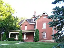 This is one of several houses in town that are noteworthy for their quoined corners, a rare architectural feature in Iowa.[2] The 2½-story brick house features an irregular roofline with both hipped and gabled areas, two large chimneys with corbelled chimney pots, and a wrap-around porch. It was built for D. H. Anderson in 1888 in a section of the city known as "Society Hill." These were financial boom years for Maquoketa. Anderson settled here with his parents in 1854, and grew to become a successful businessman. He married Mary L. Goodenow, the daughter of John L. Goodenow, who was known as the "Father of Maquoketa."