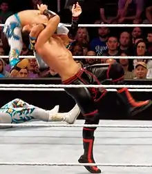 Also known as a springboard backflip three-quarter facelock inverted DDT. A wrestler puts the opponent into a ¾ facelock, then runs up the corner turnbuckles or ring ropes and jump backwards performing a backflip, and landing face down driving the opponent down to the mat back-first. Sometimes a standing variant is performed by wrestlers with adequate leaping ability or when assisted by a tag team partner. The move is popularly known, especially in North America, as Sliced Bread No. 2, a name created by wrestler Brian Kendrick.[5][6] In a slight variation named the sitout shiranui the wrestler lands into a seated position instead, driving the opponent's head between the legs. Seth Rollins used the Sliced Bread No. 2 early in NXT in 2011/2012 season.