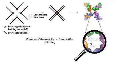 In 2001 David Liu and co-workers showed that complementary DNA oligonucleotides can be used to assist certain synthetic reactions, which do not efficiently take place in solution at low concentration.[24][25] A DNA-heteroduplex was used to accelerate the reaction between chemical moieties displayed at the extremities of the two DNA strands. Furthermore, the "proximity effect", which accelerates bimolecular reaction, was shown to be distance-independent (at least within a distance of 30 nucleotides).[24][25] In a sequence-programmed fashion oligonucleotides carrying one chemical reactant group were hybridized to complementary oligonucleotide derivatives carrying a different reactive chemical group. The proximity conferred by the DNA hybridization drastically increases the effective molarity of the reaction reagents attached to the oligonucleotides, enabling the desired reaction to occur even in an aqueous environment at concentrations which are several orders of magnitude lower than those needed for the corresponding conventional organic reaction not DNA-templated.[26] Using a DNA-templated set-up and sequence-programmed synthesis Liu and co-workers generated a 64-member compound DNA encoded library of macrocycles.[27]
