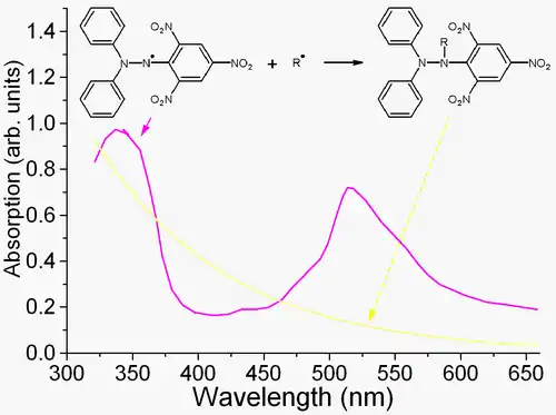DPPH is a well-known radical and a trap ("scavenger") for other radicals. Therefore, rate reduction of a chemical reaction upon addition of DPPH is used as an indicator of the radical nature of that reaction. Because of a strong absorption band centered at about 520 nm, the DPPH radical has a deep violet color in solution, and it becomes colorless or pale yellow when neutralized. This property allows visual monitoring of the reaction, and the number of initial radicals can be counted from the change in the optical absorption at 520 nm or in the EPR signal of the DPPH.[3]