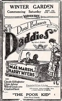 Daddies is a 1924 American silent romantic comedy film produced and distributed by Warner Bros. and directed by William A. Seiter. The film stars Mae Marsh and Harry Myers and survives today in 16mm format.[2] It was transferred onto 16mm film by Associated Artists Productions / United Artists[3] in the 1950s and shown on television.