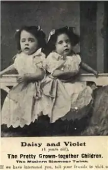 Daisy and Violet Hilton (5 February 1908 – early January 1969) were English-born entertainers, who were conjoined twins. They were exhibited in Europe as children, and toured the United States sideshow, vaudeville and American burlesque circuits in the 1920s and 1930s. They were best known for their film appearances in Freaks and the biographic Chained for Life (1951).