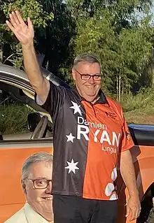 Although he consistently ran for Mayor as an independent candidate, Damien Ryan is a member of the Alice Springs Branch of the Country Liberal Party (CLP). Damien was the CLP candidate for the Northern Territory Legislative Assembly Division of Araluen in the 2020 Northern Territory election,[4][15] where he was defeated by incumbent MLA and former CLP member Robyn Lambley.[4]