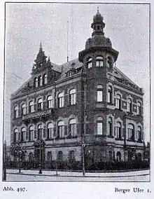 The since disappeared company headquarters were at Berger Ufer 1 (after 1945 Mannesmannufer) in Düsseldorf. The 1898 building by Klein & Richard Dörschel was showcased by the Architekten- und Ingenieurverein Düsseldorf. The basement held the quarters for the concierge and Registratur. The registratur was connected to the office on the main floor. Here were the offices of the supervisory board, and the offices of the Vorstandsbeamten. The chief executive lived on the upper floor of the building. The main view from the corner building and its protruding tower offered a view of the Rhine. The brick façade of the building had been made in the revival style of the Northern Renaissance.