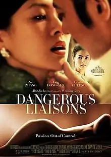 Dangerous Liaisons (Chinese: 危險關係) is a 2012 Chinese period romance drama film by Hur Jin-ho loosely based on the 1782 novel with the same title by Pierre Choderlos de Laclos. The novel has been adapted numerous times, including Les Liaisons dangereuses, an adaptation by Roger Vadim (1959), the eponymous Hollywood film (1988), Valmont (1989), Cruel Intentions (1999), and Untold Scandal from South Korea (2003).[3]