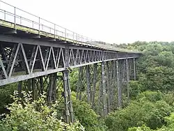 Meldon Viaduct, an iron truss bridge about 2.2 miles (3.5 km) further up the line from Okehampton, was designated as a scheduled monument and refurbished shortly after the opening of the heritage railway; a new station of the same name, unrelated to any historic station, was built at its eastern end in 2000 for the heritage railway. The track across the viaduct was lifted in 1990 as the structure was assessed to be too weak to take the weight of a train.[10]