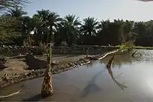 When approaching Dar al-Manasir from the surrounding deserts, the most striking feature of the landscape is the sudden green narrow band of palm trees lining the shores of the Nile. This strip of land is called Ashu (أشو), and is generally not more than 20 meters wide. It is situated between the seasonally inundated land of the river bank called Gerif (جرف) and the traditional "waterwheel land" called Saqiah (ساقية).[3]