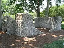 Introduced in the southeast by early Spanish settlers, tabby is a type of concrete made by burning oyster shells to create lime, then mixing it with water, sand, ash and broken oyster shells.[20] Three of the best-preserved, tabby-walled single slave dwellings still standing in Beaufort County can be found today at Haig Point.[21]