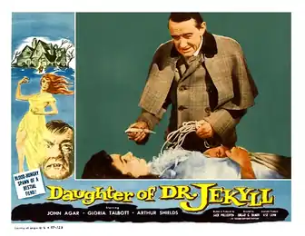 Daughter of Dr. Jekyll is a low-budget black-and-white 1957 American horror film produced by Jack Pollexfen, directed by Edgar G. Ulmer and released by Allied Artists.[1] The film is a variation on the 1886 gothic novella Strange Case of Dr. Jekyll and Mr. Hyde by Robert Louis Stevenson. It stars Gloria Talbott, John Agar and Arthur Shields. In the film, Janet Smith (Gloria Talbott) learns that she is not only the daughter of the infamous Dr. Henry Jekyll, but is convinced by her guardian, Dr. Lomas (Arthur Shields), that she has inherited her father's transformative condition. Janet begins to believe that she turns into a monster after two local women are found horribly killed[2] and nearly takes her own life because of it. However, all is not what it seems.[3]