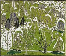 Between the years of 1919 and 1929, Milne lived in Boston Corners and the surrounding areas, focusing his artistic work on the landscape. He spent the winter of 1923–24 in Ottawa in hopes of finding government patronage and a position.[9] During his six months in the city, Milne produced several paintings and watercolours. Six of his works were purchased by the National Gallery of Canada. However, Milne was unable to secure a job in the federal government and returned to Upper New York State.[10] In 1929, Milne returned to Canada to paint in Temagami, Weston and Palgrave. He separated from his wife in 1933, moved to Port Severn, Ontario, and sold many of his paintings to prominent art patrons Vincent Massey and Alice Massey.[11] In the late 1930s, Milne settled down in Uxbridge, Ontario, with Kathleen Pavey, a nurse, and the two had a son (also David) in 1941. During the later years of his life, Milne worked again in watercolours, and changed his subject matter to more whimsical, fantasy and childlike inspirations. He continued to travel to Algonquin Park and Baptiste Lake to paint the Canadian landscape.[12]