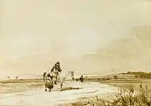 Cox's reputation as both a painter and a teacher had been building over previous years, as indicated by his election as a member of the Society of Painters in Water Colours and his inclusion in John Hassell's 1813 book Aqua Pictura, which claimed to present works by "all of the most approved water coloured draftsmen."[15] The depression that accompanied the end of the Napoleonic Wars had caused a contraction in the art market, however, and by 1814 Cox had been very short of money, requiring a loan from one of his pupils to pay even for the move to Hereford.[15] Despite its financial advantages and its proximity to the scenery of North Wales and the Wye Valley, the move to Hereford marked a retreat in terms of his career as a painter: he sent few works to the annual exhibition of the Society of Painters in Water Colours during his first years away from London and not until 1823 would he again contribute more than 20 pictures.[16]