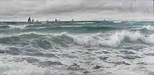 James exhibited throughout London and at the Royal Academy in 1886 (living in Dalston), 1888 (having moved to Maida Vale), 1892 and 1897.[3] Like Henry Moore (painter), James was more interested in pure studies of the sea, rather than topographical coastal views. He was especially good at painting waves.