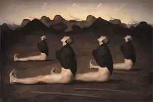 The painting depicts four identical men in a grey rocky landscape. The men are seen from the side as they sit on the ground, largely naked, with scull caps and leather wrapped around their shoulders; they face the sky above them with closed eyes and open mouths. Each of the men has a staff lying in the ground, near them.