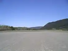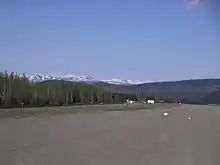 Dawson City Airport (IATA: YDA, ICAO: CYDA) is located 8 nautical miles (15 km; 9.2 mi) east of Dawson City, Yukon, Canada, in the Klondike River valley, and is operated by the Yukon government. It has a terminal building and a runway which was paved in May 2019.[4] The asphalt runway is 5,003 ft × 100 ft (1,525 m × 30 m) long and at an elevation of 1,215 ft (370 m). A number of studies have recommended moving the airport or realigning the runway as it is in a narrow mountain valley.