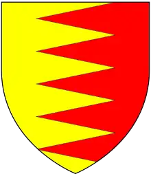 Abandoned the de Birmingham's traditional coat of arms and replaced it with:- partie per pale, indented, or, and gules.[11]