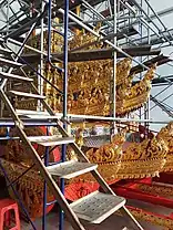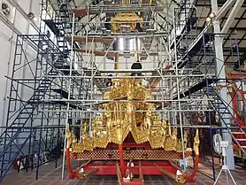 Designs for the cremation complex were officially unveiled on 28 October 2016, and a special ceremony was held on 19 December for the royal funeral chariots to be used at the Bangkok National Museum.[37][38][39] The construction work for the complex officially commenced on 27 February 2017 with the building of the central column with a September target completion date.[40][41] The crematorium was the biggest, largest and tallest yet since the state cremation rites for King Rama V (Chulalongkorn) in 1911.[42]
