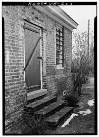 By the first decades of the nineteenth century the jailer's house was already sorely in need of repair, and consequently the county began to study the possibility of finding an alternative use for the property. At around the same time a state law had been passed requiring provision of separate facilities for debtors and felons. Thus, in 1824 a committee that was set up by the county court reminded that body that the law did not actually require the county to provide quarters for a jailer; furthermore, such an arrangement was highly unusual, if not unheard-of, in any other county in Virginia. Consequently, it was recommended that the house be reappropriated and reconfigured to serve as a debtors' prison, especially as it was thought that the proximity of the jailor's house to the jail posed a security risk. The committee held that little work needed to be done to convert the jail to its new purpose, saying "that iron bars to the windows of inch iron and oak Batton doors to be hung outside, is all that is necessary to be done to the said house, to answer the purposes intended, because it is believed that debtors have no inducement to brake [sic] prison, the Law authorizes them with little trouble to discharge themselves whenever they wish so to do.[2]" The conversion was finished quickly,[8] and the house served in its new capacity until 1849,[4] when imprisonment for debt was discontinued in Virginia. The old jail and wall were demolished by the county in 1909; the debtors' prison was turned over to the Drummondtown Branch of Preservation Virginia (formerly known as the Association for the Preservation of Virginia Antiquities). That organization undertook a partial renovation of the property in 1911, revisiting it for a fuller restoration in 1953. From 1911 until 1927 the building was used as a library; today it is a museum of local history,[2] and is furnished to represent a typical middle class home of the eighteenth century.[9] The Accomac debtors' prison was surveyed by the Historic American Buildings Survey between 1958[2] and 1961, when it was found to be in good condition; the formal report was placed on file in 1961.[7] The building is open by appointment.