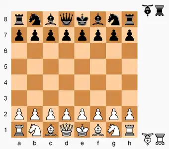 Falcon–hunter chess starting position. The falcon and the hunter, represented here by inverted pieces, are initially off the board.