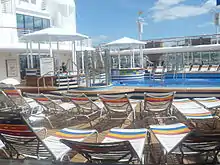 Folding deckchairs became widely popular in the late 19th and early 20th centuries. During the golden age of ocean liner travel, the deckchairs upon ships' decks were sometimes reserved for particular passengers for whom crew would attach a paperboard name tag to the wicker seat-back. Such a tag is visible on an empty deckchair near the center in a famous 1912 photo showing survivors of the RMS Titanic disaster after rescue while they rest on the deck of RMS Carpathia.[6][7] The same system was in use aboard Carpathia two years later; a reservation tag is visible on the empty deckchair in the lower right of a 1914 photo. The deckchairs shown on some of those photographs are of the more solid "steamer chair" type, rather than the portable canvas-seated chairs. The Titanic carried 600 such wooden chairs;[3] six were known to survive, of which one was sold in 2001 for £35,000.[3]