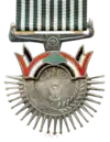 The Medal of the Alliance consists of two classes medal.The first layer consists of a background of black and green colours. the second layer consists of a five-pointed star representing the five categories of the People's Working Forces Alliance. In the centre of the star is the emblem of the Republic on white ground. The emblem is surrounded by a red ring, symbolising national unity within the People's Working Forces Alliance framework. Five groups consisting of five rays emerge from the heads of the star. The decoration hangs from a ribbon of one colour, green.[5]