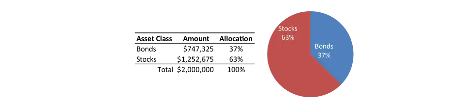 Returning to our example, assume that this “income portfolio” were actually purchased, and the balance of the funds were invested in a “growth portfolio” of equity mutual funds or similar types of faster growing investments. The initial asset allocation would become 37% bonds, 63% stocks (see Table 3).