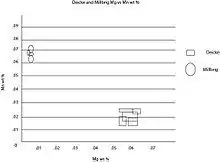 The Deicke and Millbrig bentonite layers can also be correlated due to certain elemental concentrations found in mineral inside of the bentonite layers. One such mineral that is useful is apatite. In one study done by Emerson et al. 2004, they compared the percent weight concentrations of manganese and magnesium in the mineral to differentiate between the two layers at different outcrops. For analysis of apatite for the Deicke bentonite layer, they collected 36 grains from two different locations and used electron microprobe analysis. Researchers found that there is a manganese weight percent of 0.02 and a magnesium weight percent 0.058. There were no significant differences found between the different localities. For the Millbrig bentonite layer, researchers found that there is a manganese weight percent of 0.064 and a magnesium weight percent 0.013.[6] For the Millbrig bentonite, there were also no significant differences between localities. The data that was collected had a ± 2 σ uncertainty. Using this information, current researchers can use similar methods to find the manganese and magnesium weight percentages and, depending on the data, can correlate the bentonite layers they find and identify them as either the Deicke or Millbrig bentonites.[6]