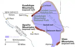 The Delaware Basin is a geologic depositional and structural basin in West Texas and southern New Mexico, famous for holding large oil fields and for a fossilized reef exposed at the surface. Guadalupe Mountains National Park and Carlsbad Caverns National Park protect part of the basin. It is part of the larger Permian Basin, itself contained within the Mid-Continent oil province.