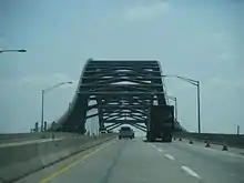 The Delaware River–Turnpike Toll Bridge is a four-lane, steel through arch bridge crossing the Delaware River between Burlington Township, Burlington County, New Jersey and Bristol Township, Bucks County, Pennsylvania. As a part of Interstate 95 (I-95), it is a major highway link between Philadelphia and New York City. The bridge also connects the Pennsylvania Turnpike's east-west mainline with the main trunk of the New Jersey Turnpike, via the Pearl Harbor Memorial Turnpike Extension (formerly known as the Pennsylvania Extension). Tolls are collected only in the west/southbound direction via electronic toll collection.