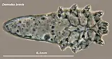 Demodex brevis is one of the two species of face mite that inhabit humans (the other being Demodex folliculorum). They are about half as long, at 0.15 to 0.2 mm (6 to 8 thousandths of an inch),[1] as D. folliculorum, but otherwise have few differences. Most of the article on Demodex folliculorum applies equally to D. brevis.