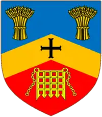 Per chevron Azure and Gules, on a Chevron between in chief two Garbs and in base a Porcullis chained Or, a Cross-Moline Sable.