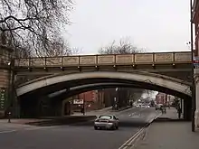 The line was to cut directly through Derby, requiring the demolition of many slum properties. Politically and commercially influential people in the town were favourable to the GNR, but it is suggested that there was some naivety in the easy approval of the GNR's intentions.[9] The project was authorised on 25 July 1872;[10][8] in addition to the main goods depot off Friar Gate, a subsidiary yard was planned in Duke Street, giving access to a centre of industrial activity there. This was authorised in 1874, and involved a northward spur running down from the main line at Darley Lane Junction, some way north east from Friargate, to a shunting neck on the riverside. From here a southward reversal was necessary to reach the goods yard itself.[11]
