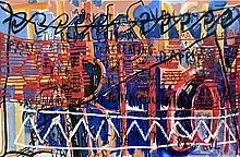 Stokou is known for transposing swaths of online textual data onto canvas.[6] Boiling her painterly impulse down to an essence, she has said: “What I really try to create is a dialogue, a monologue, if you will. I’m very interested in communication and the way information passes…I look at the text and I want to paint it.”[7] Her engagement with and use of text draws mainly from digital platforms and messages, tracking not only the content of social exchanges but the contemporary infrastructure that bears them as well. Tangled layers of text appear at points legible and illegible beneath abstract smears and swipes of color[8] that together convey a sense of amped up, frenetic energy characteristic of her work. Writing in The New York Times, Roberta Smith described Stokou's paintings in her 2013 exhibition, “Bulletproof” at Derek Eller Gallery, where “[m]oments of legibility rise to the surface and then sink back into the works’ eccentric, generally monochromatic tactility...Stokou's loquacious, streetwise paintings build on precedents from Cy Twombly, Jean-Michel Basquiat, Suzanne McClellan and Sean Landers to conjure an impression of colliding voices, opinions and needs.”[9]