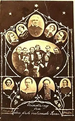 The first staff by Ole Bull's The Norwegian Theater in Bergen, with Johannes Brun, Louise Brun, Andreas Isachsen, Fredrikke Nielsen, Lucy Wolf, Jacob Prom among others