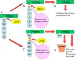 13. 1 2 Wing SS (May 2003). "Deubiquitinating enzymes--the importance of driving in reverse along the ubiquitin-proteasome pathway". The International Journal of Biochemistry & Cell Biology. 35 (5): 590–605. doi:10.1016/s1357-2725(02)00392-8. PMID 12672452.