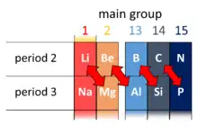 - ↑ Shriver, Duward (2006). Inorganic Chemistry (4th ed.). Oxford University Press. ISBN 978-0199264636. Li/Mg p. 259; Be/Al p. 274; B/Si p. 288.