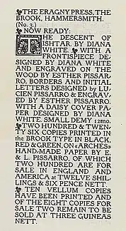 - ↑ Pissarro, Lucien; White, Diana; Pissarro, Esther (1903). The descent of Ishtar. London : Eragny Press; New York : John Lane.