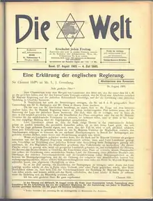 Die Welt ("The World") was a weekly newspaper founded by Theodor Herzl in May 1897 in Vienna. It was designed to promote Zionism and boldly proclaimed itself to be a Judenblatt (Jew-paper).[1] From 1897 to 1914 it was the principal organ of the Zionist movement. From 1897 to 1900, the paper was edited by Erwin Rosenberger.[2]
