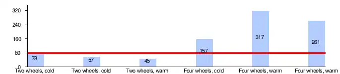 The engine software changed the engine behavior based on whether two or four wheels were rotating. In an Opel Zafira front-wheel-drive vehicle, the NOx emissions were within the 80 mg/km legal limit – but only when the vehicle was on a test stand, with the front wheels rotating and the rear wheels being stationary. When the rear, unpowered wheels were made to rotate too (which is how a front-wheel-drive vehicle behaves on the road), the NOx emission were twice the limit (cold engine) or three to four times the limit (warmed-up engine).[26][27][28]