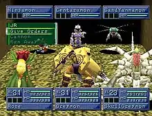 Digimon World 2 is a dungeon crawler RPG, a departure from its predecessor Digimon World, which focused on raising Digimon like pets. The player explores vast labyrinths dubbed "Domains", inside a tank called a "Digi-Beetle". These dungeons are filled with enemy Digimon, who once encountered, trigger a battle with the player's own team of Digimon in a battle system similar to other traditional turn-based JRPG's. The domains also contain various obstacles and traps such as land mines, energy fields called "Electro-Spores", giant stones, acid floors, treasure chests. Most traps can be disposed of by items that can be purchased at stores found across the game, and enemy Digimon can be befriended with "gift" items. However, the Digi-Beetle has a limited inventory, requiring careful management of items. Typically, at the end of each Domain there is a Boss, whether it be a lone Digimon, or another Tamer with a team of them. After defeating the Boss, the player may exit the Domain by means of an "Exit Portal" found near the Boss' location.