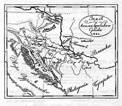 Map called: "Territories inhabited by Servians". It forms a supplement to the first edition of the book: "History of the Servian People, edited by Dimitrije Davidovic," This map has appeared in Vienna in 1821. The map shows the ethnological boundaries of the Serbian people.[3][4]