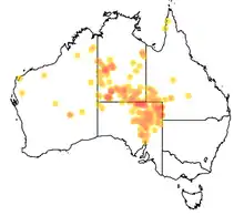 The canegrass dragon is an endemic species found in the arid zones of Australia, with a rainfall of less than 500mm.[5] It's predominantly found in the region surrounding the junction of the Northern Territory, Queensland, New South Wales, and South Australia borders. However, it also occupies habitat across Western Australia as far as the northern West Australian coastline. The canegrass dragon is usually found on desert sand ridges or other sandy soils in amongst ground litter, cane grass, spinifex or hummock grasses.[6] The canegrass dragon is rarely sighted, despite not being rare, due to its excellent camouflage and secretive behaviour.[2]