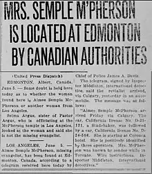 For a time Mildred Kennedy, McPherson's mother, offered a $25,000 (equivalent to $413,252 in 2022) reward for information leading McPherson's return. During the period of her disappearance, while there were "various and voluminous claims," of McPherson sightings, none at all came from Carmel-by-the-Sea, a California town that would later dominate the headlines for such sightings. After the reward expired, on June 5, newspaper headlines announced McPherson had been found in Canada, as given by Inspector Middleton of the Royal Northwest Mounted Police, which shook up Los Angeles. Upon receiving the news, Kennedy wanted her daughter returned to her as soon as possible. [10] [11]