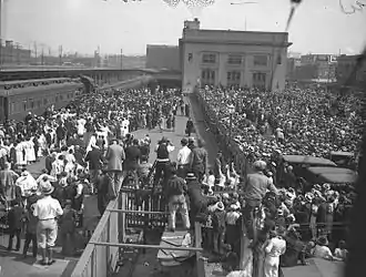 Following her return to Los Angeles from Douglas, McPherson was greeted at the train station by 30,000–50,000 people, more than for almost any other personage.[32] The parade back to the Temple even elicited a greater turnout than President Woodrow Wilson's visit to Los Angeles in 1919, attesting to her popularity and the growing influence of mass media coverage.[33][34][32]