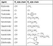 Increased carbon length of the nitrogen R2 side chain alters activity. Side chain that is made out of three carbons has proven to be the most ideal length in terms of activity, increasing or decreasing the length of the chain from there has negative effect on biological activity. Alendronate, a common bisphosphonate drug, has a three carbon length side chain for example.[17] Risedronate has heterocyclic structure containing nitrogen. Heterocyclic nitrogen containing bisphosphonates have revealed better results in terms of activity compared to earlier bisphosphonates with nitrogen bound to carbon chain. Studies on risedronate analogous with different placement of nitrogen on the ring have shown no measurable difference on biological activity. Increased length of carbon chain connected to the ring revealed negative results.[18] Zoledronate is the most potent bisphosphonate drug today only available as intravenous injection. It is the only bisphosphonate drug that has two nitrogen groups in the side chain hence its potency and route of administration differs from other drugs in the same class.[16]