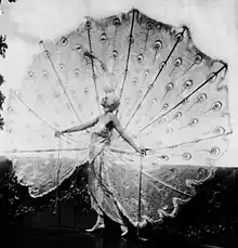 In Midnight Frolic of 1919, Dolores played the part of The White Peacock in the Tropical Birds number. She wore a 10 feet (3.0 m) high peacock costume designed by Pascaud of Paris which Marjorie Farnsworth described as "one of the loveliest costumes ever seen on Broadway".[17] According to one reviewer, a member of the audience asked another, "Is she going to dance?" to which the reply came, "A woman who can stand and walk like that doesn't have to dance."[2] The idea of a peacock costume was not new as Anna Held had worn one in Follow Me in 1916 but it was Dolores who made it her own. Gertrude Hoffmann wore a similar costume in 1920.[18]