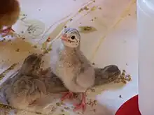They lay 25โ30 eggs in a deep, tapering nest. Their eggs are small, dark and extremely thick-shelled. The hens have a habit of hiding their nests, and sharing it with other hens until large numbers of eggs have accumulated. The incubation period is 26โ28 days, and the chicks are called "keets". As keets, they are highly susceptible to dampness (they are indigenous to the more arid regions of Africa) and can die from following the mother through dewy grass. After their first two to six weeks of growth, though, they can be some of the hardiest domestic land fowl.