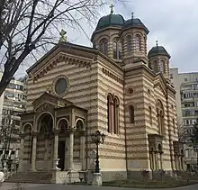 The present church, the fourth in the area, was built on the same site between 1881 and 1885, in Romanesque and Gothic Revival style. Metropolitan Calinic Miclescu led the project. Alexandru Orăscu was the architect, assisted by Carol Benesch and Friedrich Hartmann; his plans were reviewed by Jean-Jules-Antoine Lecomte du Nouÿ. King Carol I and Queen Elisabeth attended the liturgy and cornerstone laying on June 14, 1881, three months after the Kingdom of Romania was proclaimed.[1] When the couple attended, they would sit to the left of the altar on thrones carved with the royal coat of arms and the official motto Nihil sine Deo; these remain in place. During the interwar period, the church was popular with the elite, who would hold weddings and baptisms inside; in keeping with its festive nature, the church has never hosted a funeral.[2]